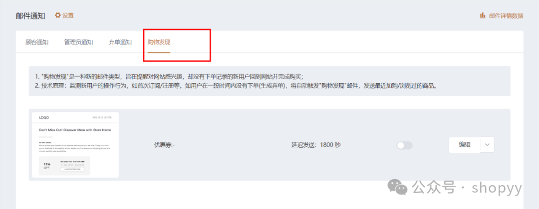1.登录您的店铺后台,访问「店铺设置」→「系统设置」→「邮件通知」→「购物发现」,即可启用。您可以设置延迟发送时间,或在邮件中添加优惠券。具体邮件机制如下: